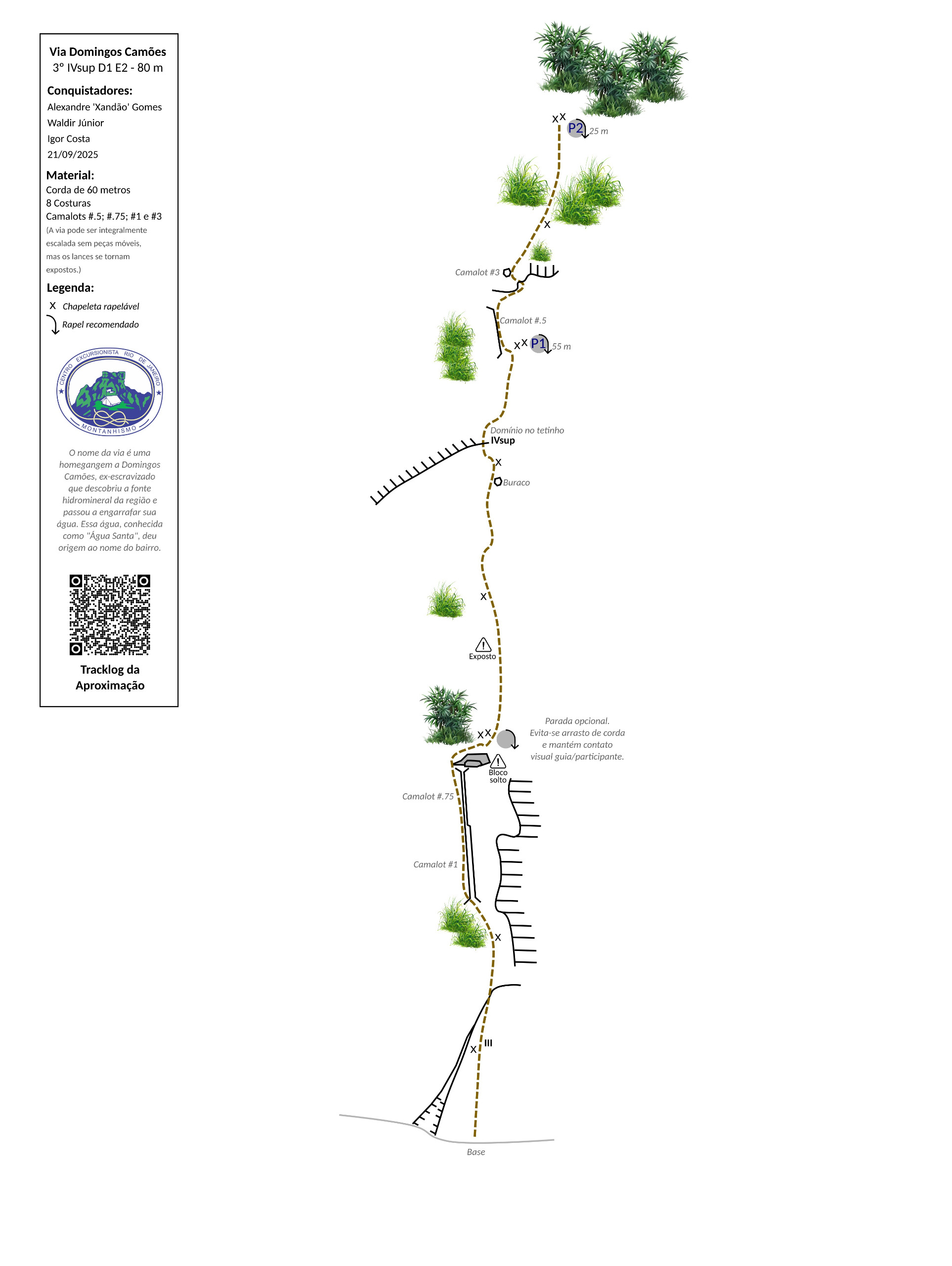 A Domingos Camões é uma via diversificada: saída em aderência; uma bela fenda frontal, mas fácil; domínio em blocos; domínio de um tetinho picante (IVsup), mas bem protegido; tudo isso entremeado por trechos de agarras e agarrência.