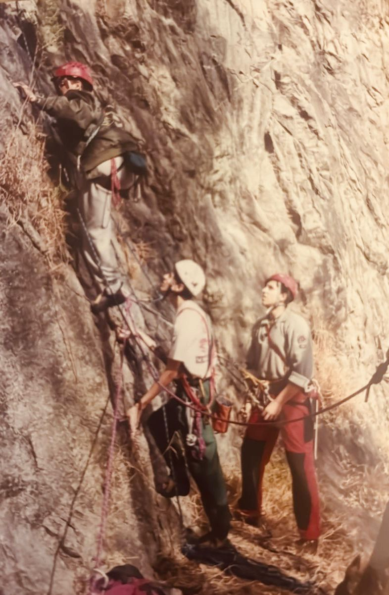 Os conquistadores Didier, Marco e Aécio no crux logo na saída da segunda enfiada da Gladiador.