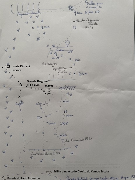 Descrição: A linha começa na parada dupla do final da Via Até com Chuva seguindo uma horizontal e diagonal para a esquerda cruzando perpendicularmente um projeto antigo da parede. Há boas possibilidades de proteção móvel e após a sua metade há vegetação que pode atrapalhar na orientação da via. O final é em uma árvore de destaque de onde se pode rapelar (30m) ou escalar novamente na direção do início da via.