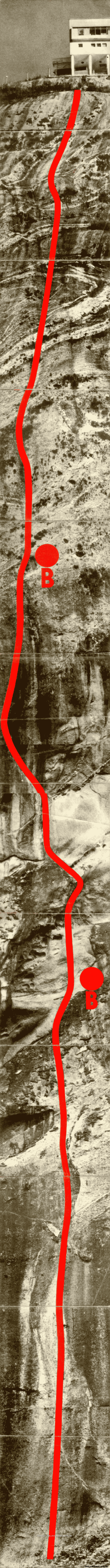 Começa por um cabo de aço, seguido de artificial A1 que também pode ser feito em livre (VIIa). Ao final do primeiro A1, existe (ou existia) uma mega laca solta, bem embaixo da parada dupla.