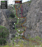 Descrição: Via levemente positiva com boas agarras e regletes bem óbvios, segue numa sequencia muito bonita e bem movimentada, chegando nas ultimas chapas, deve-se encarar o lance de aderência um pouco exposto, mas bem observado, encontra-se todas as possibilidades.