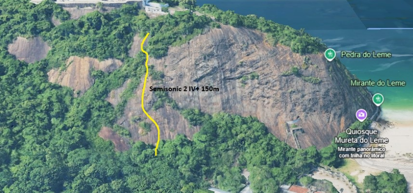 Descrição: Via com 3 esticões de 50m e com proteção mista. O início se dá logo após a escadaria de Santa Bárbara dentro das instalações do Forte.
