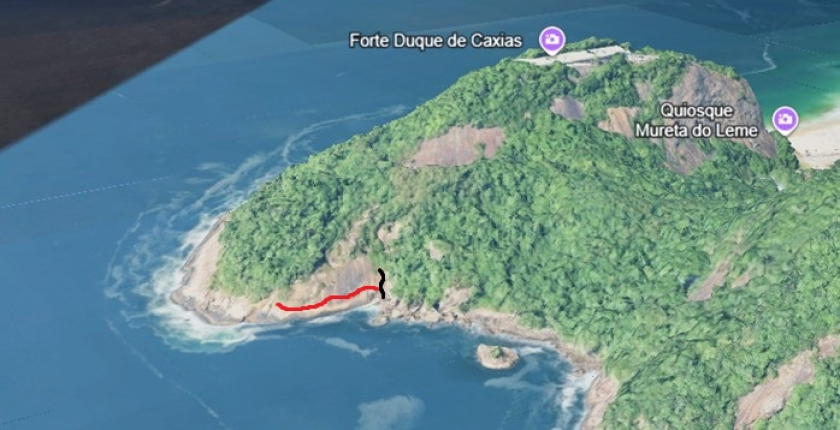 Descrição: Via com excelente visual do mar. Localiza-se no final da trilha que desce da estrada para a enseada dos pescadores. Ver detalhes no mapa geral de localização das vias do Morro do Leme e do Morro do Urubu.