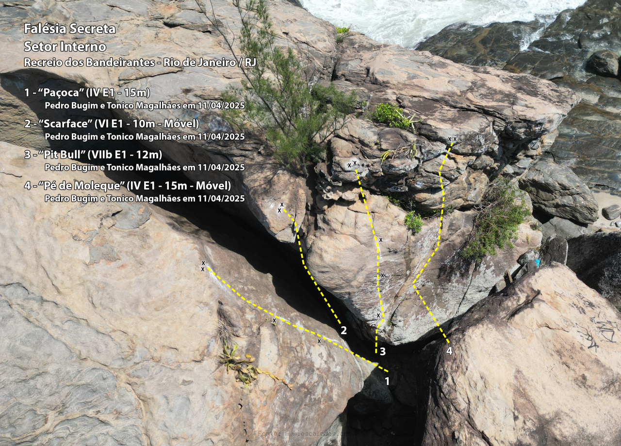 Descrição: Belíssima via, com movimentos muito peculiares. Segue uma incrível fenda negativa, embora seja feita praticamente toda em chaminé. Inicia como uma chaminé tradicional, evoluindo para tesoura. Na parte superior, deve-se escalar com os pés em uma parede e as mãos na outra, pois fica muito larga, até mesmo para tesoura. Nas passadas finais, há um lance de boulder, bem aéreo e negativo, para "ganhar" a parede principal e chegar à parada dupla do topo, em chapas PinGo inox 304L. Recomenda-se utilizar friends e hexentrics grandes, de preferência o camalot #6, para os lances finais.