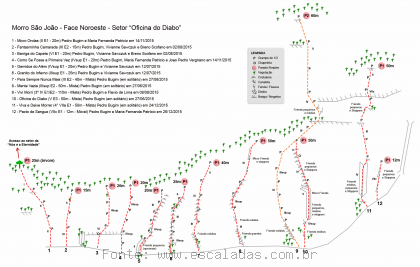 Descrição: Via mista que inicia em uma canaleta fácil e com certa vegetação, chegando a uma fenda perfeita, protegida por Friends médios. Daí, faz-se uma diagonal para a direita (crux da via), para atingir o primeiro grampo da via. Deste ponto em diante, a via é toda protegida por grampos de 1/2" até o final, em lances de agarras. Via conquistada em solitário.