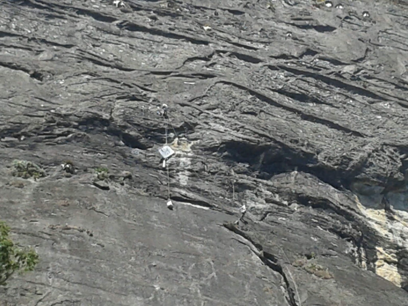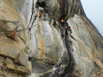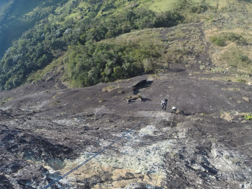 Leonardo Amorim na recém conquistada P4, puxando o portaledge já montado e Job de Assis no final do diedro, auxiliando na corda, em 2015.