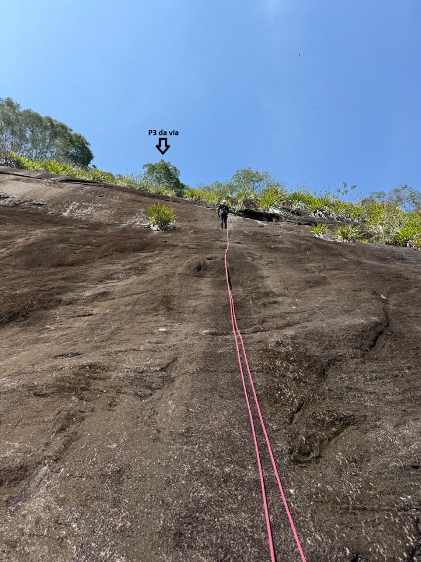 Descrição: É a maior via do Campo Escola do Retiro e foi a primeira a ser conquistada na Face NO. Para acessar a base deve-se seguir as dicas de acesso ao Campo Escola. Chegando na Face SE do Campo Escola, seguir pela trilha (à direita) em direção ao Mirante. Chegando no mirante, seguir para a esquerda (cerca de 50m) até encontrar uma pequena mata. Descer essa mata cerca de 50m e observar a sua esquerda uma árvore que se destaca na parede (é a P3 da via). Rapelar dessa árvore até a base (ver croqui). Com corda de 60m dá para fazer todos os rapéis. A via é mista, possuindo proteções em móvel no primeiro e segundo esticões.