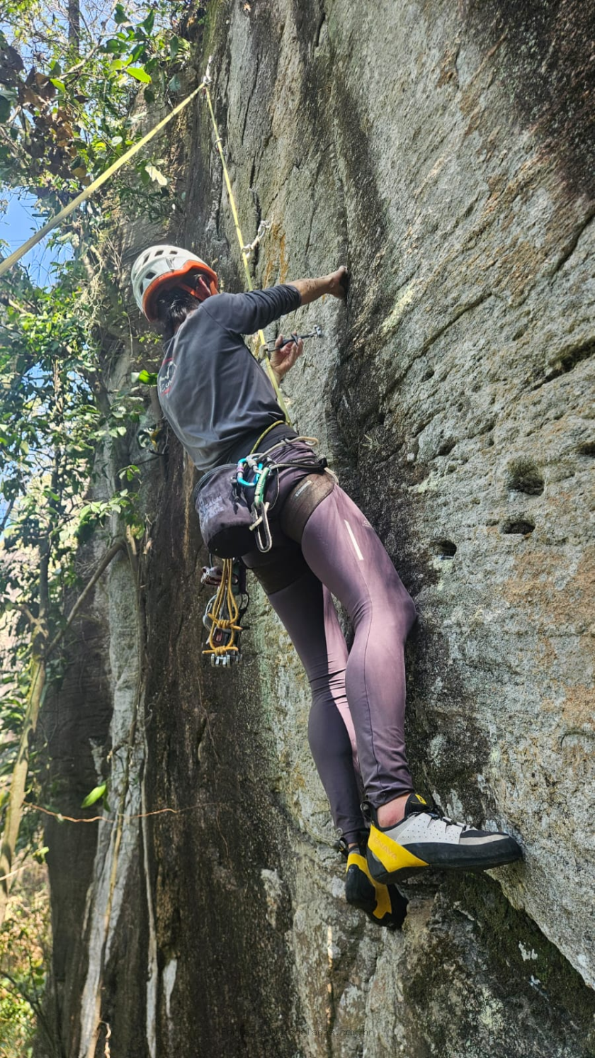 Descrição: A via começa protegida em móvel por um fenda de dedo, mas logo sai para esquerda escalando em boas agarras e passando por duas chapas até chegar na parada.