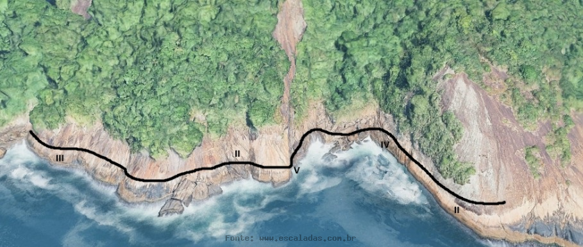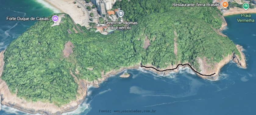 Descrição: Via com vários lances para se proteger em móvel com passagens à beira do mar. Conecta a enseada dos pescadores no Morro do Leme à enseada da Praia Vermelha.