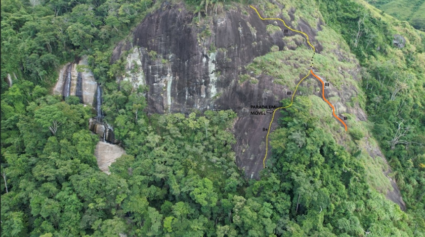 Descrição: Linha, em laranja na foto, que possui algumas proteções em móvel e que pode ser utilizada para acessar o platô para o último esticão da Via da Lelê ou da Via Rio Claro.