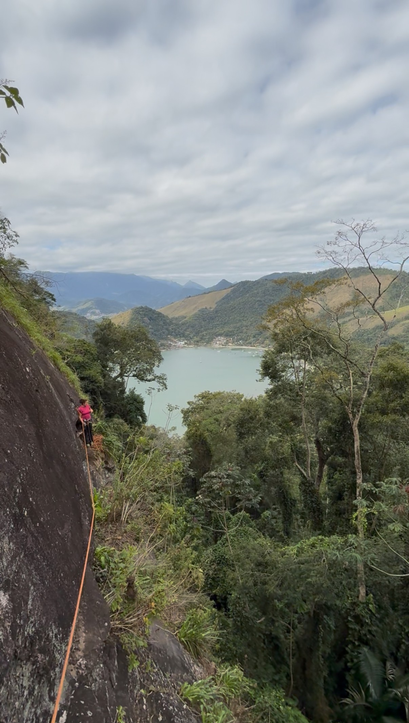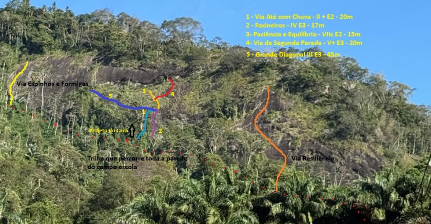Descrição: A linha começa na parada dupla do final da Via Até com Chuva seguindo uma horizontal e diagonal para a esquerda cruzando perpendicularmente um projeto antigo da parede. Há boas possibilidades de proteção móvel e após a sua metade há vegetação que pode atrapalhar na orientação da via. O final é em uma árvore de destaque de onde se pode rapelar (30m) ou escalar novamente na direção do início da via.