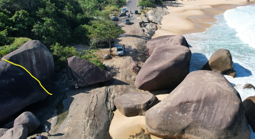 Descrição: A via em um dos maiores blocos da Praia do Cepilho e segue paralela à fenda. Pode ser montado top rope acessando o bloco pela parte de trás.