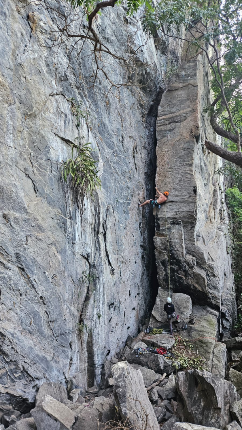 Descrição: Via com 6 chapas mais top que segue pela aresta da esquerda da grande laca no negativo do Machado.