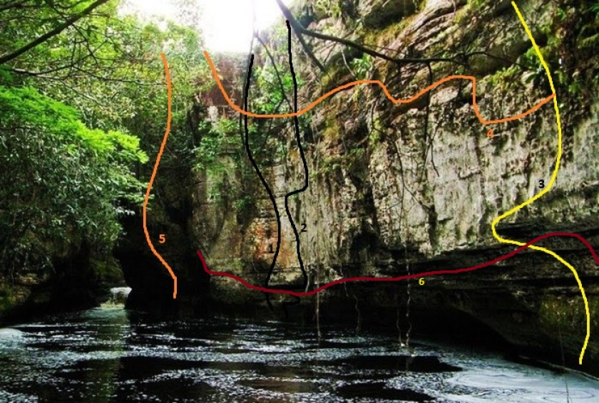 Descrição: Psicobloc mais exigente tecnicamente e fisicamente no setor. Atravessa o paredão da direita para a esquerda na sua porção mais baixa passando por tetos e trechos negativos exigindo boa resistência. A linha do psico é a de número 6 na foto.