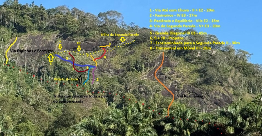 Descrição: Essa linha é a forma mais rápida e fácil de se acessar a Segunda Parede da Face SE no Campo Escola Mirante do Retiro em Angra RJ. Ela sai da última proteção da Via Até com Chuva e segue em diagonal até a trilha da base. A sua primeira metade é um 2° e a sua segunda metade um 1°.