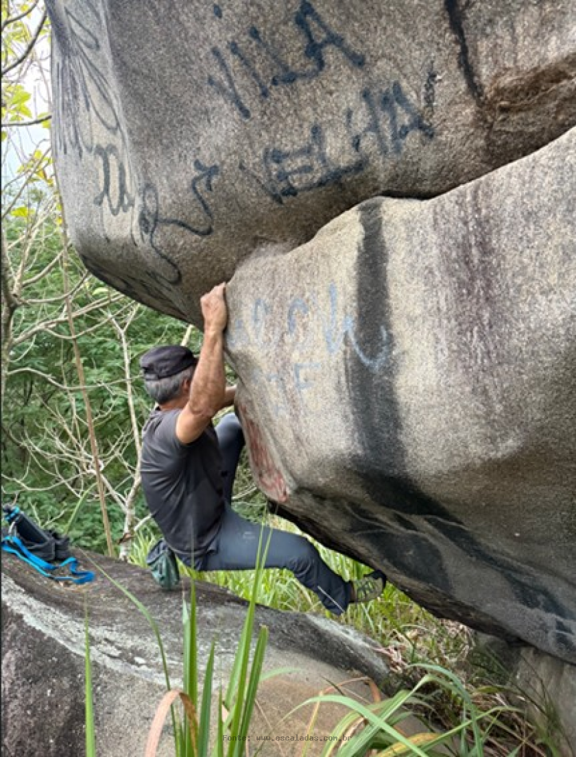 Descrição: A linha está em um bloco ao lado da trilha e é facilmente identificado pelas pichações no seu entorno. É uma transversal em uma "ranhura" e fissura que atravessa o bloco da esquerda para a direita.