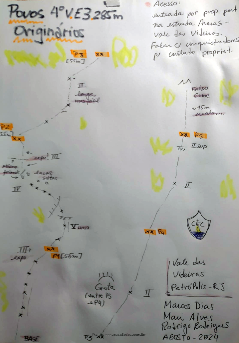 Como chegar à base: o melhor acesso é pela propriedade que fica na frente da via, mas, inicialmente, sugerimos que entre em contato com os conquistadores para que seja feita essa ponte com os proprietários. Após as primeiras repetições, poderá ser articulado um protocolo de acesso, a ser divulgado mais amplamente.