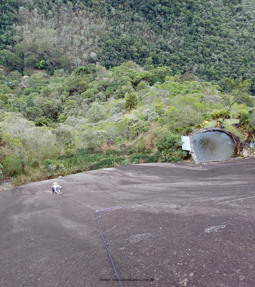 Descrição: Primeira via aberta nesse paredão, ao lado da cachoeira do Vale das Videiras. A linha está bem protegida nos lances mais delicados, com grampeação longa nos lances mais fáceis.
