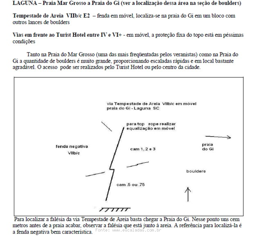 Descrição: Fenda em móvel, localiza-se na praia do Gi em um bloco com outros lances de boulders. Maiores informações sobre essa via no Catálogo de Tubarão e Região - 2ª Edição de 2009.