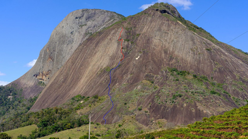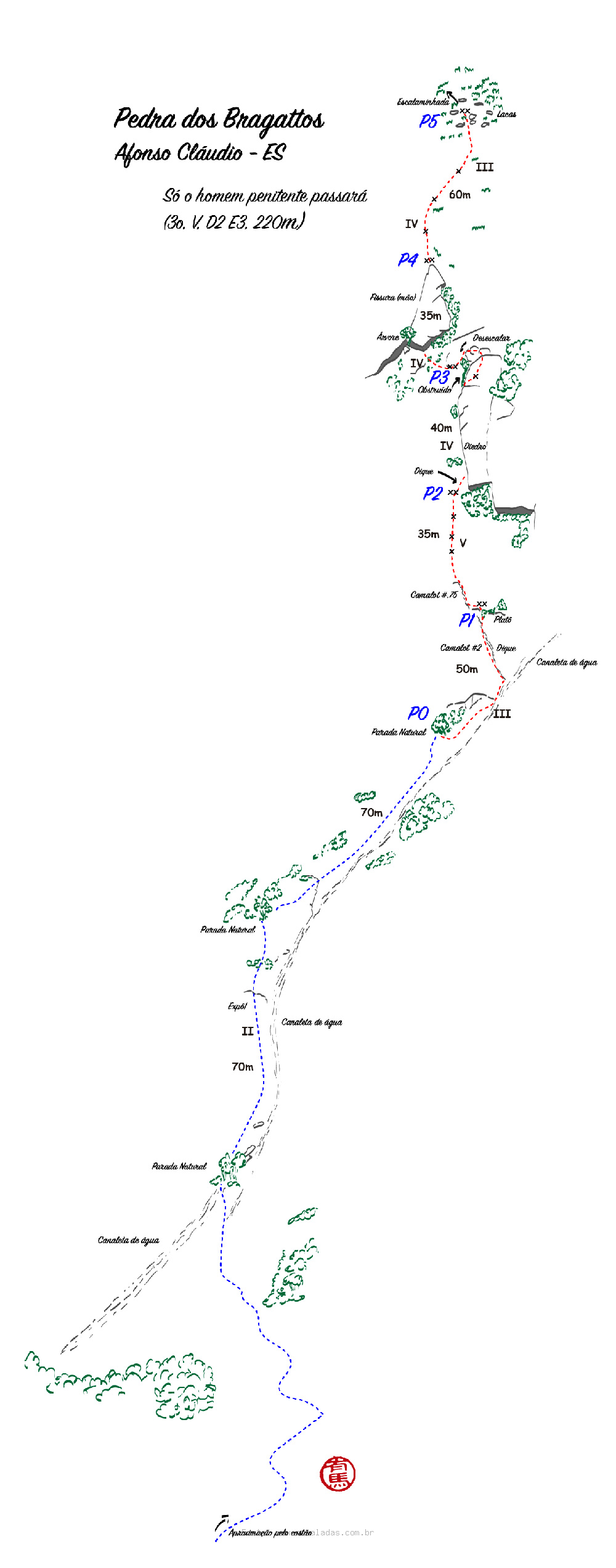 A aproximação desta via exige uma longa escalaminhada por um costão. Este trecho intercala trechos mais técnicos com caminhada. Avalie bem cada trecho para escolher o melhor trajeto e caso sinta necessidade entre encordado. O trecho do costão não possui proteções fixas, mas há algumas colocações móveis de boa qualidade. Além disso, a cada 60-70m há bons platôs de mato para montar uma parada natural. No geral, a escalaminhada transcorre pela principal calha d´água que desce da pedra.