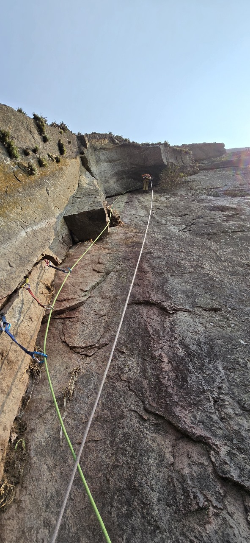 Durante mais 3 dias, escalamos um belo diedro bem marcado na parede, com boas fendas, o que facilitou o processo, apesar de algumas partes estarem cobertas de terra e ervas daninhas. No último dia, conseguimos superar dois grandes tetos com fendas largas (offwidth). Depois, voltamos ao refúgio e passamos uma noite lá para tomar banho e descansar um pouco. Como era setembro e tínhamos passado por uma onda de calor, todos os dias as temperaturas ultrapassavam os 35°C, o que nos deixava muito exaustos. Cervejas e pizzas recarregaram nossas energias.