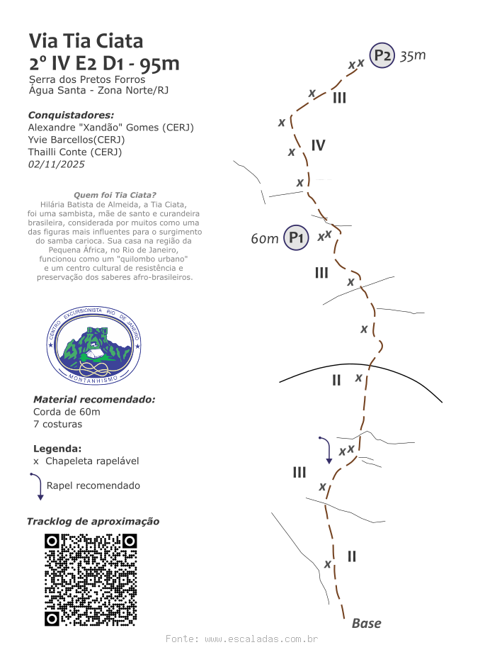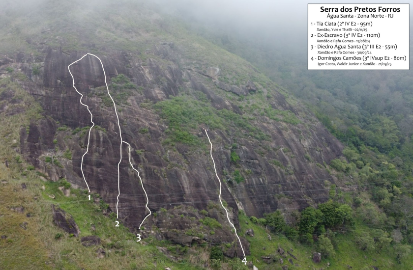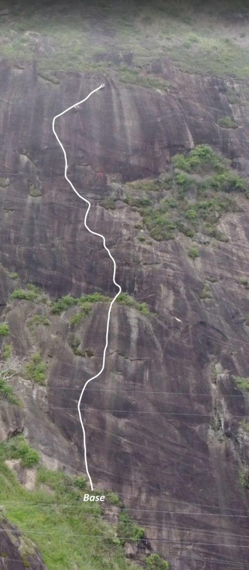 A primeira enfiada começa em uma leve diagonal para a esquerda que percorre a canaleta da rocha. Após a segunda chapeleta, segue na direção nordeste, avança sobre um pequeno teto e segue rumo ao platô de mato. Continua pela parede até uma parte mais lisa, onde se faz uma pequena horizontal para a esquerda e sobe até a P1.