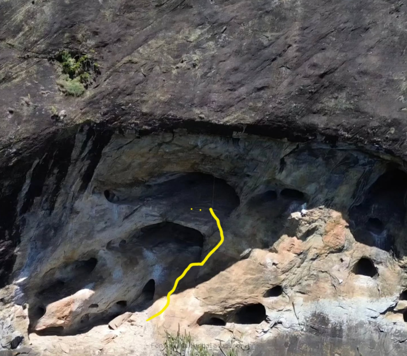 Descrição: Via curta e bem protegida para acesso a caverna principal. Lances protegidos, com agarras. Atenção pois tem pedras soltas ainda para serem retiradas do trajeto.