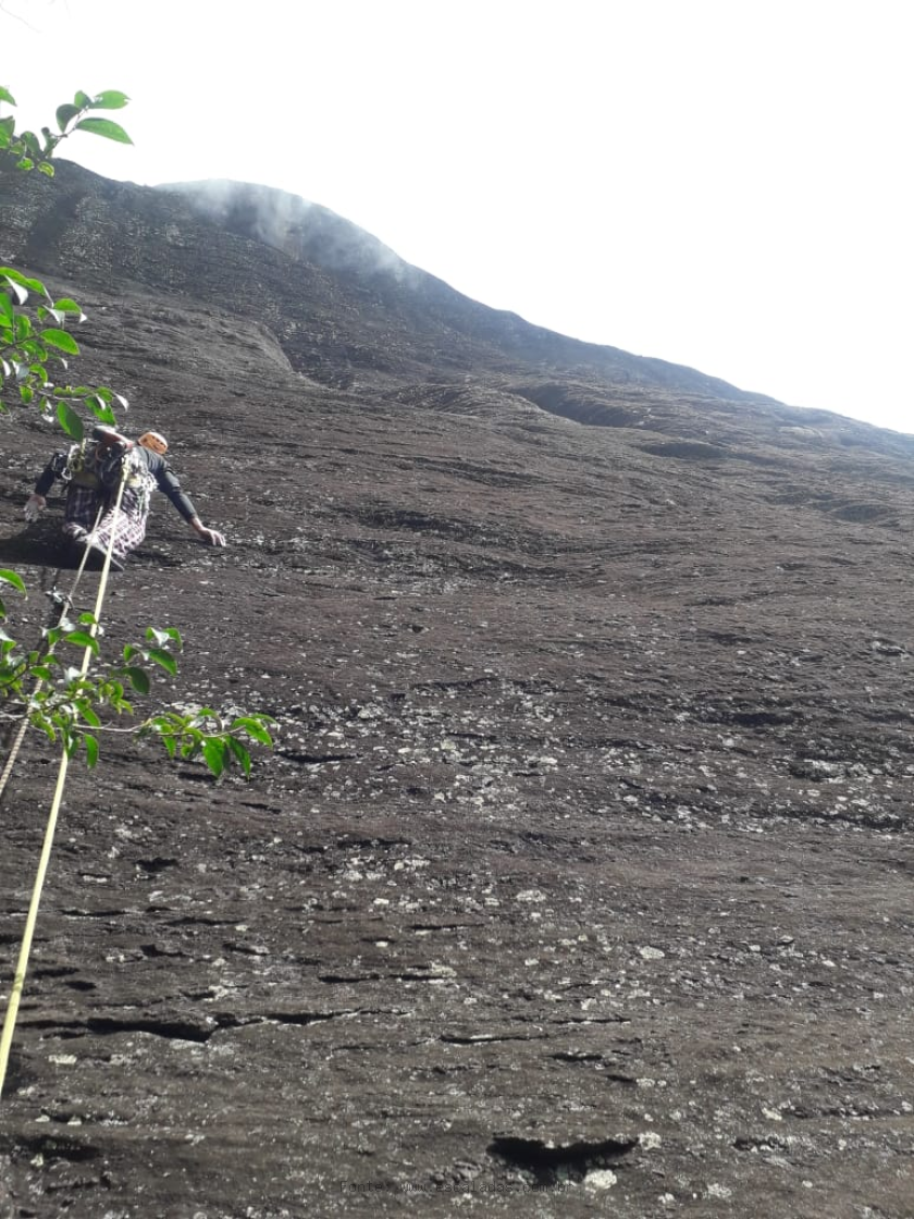 Rapel possível com 2 cordas de 60 m ou retorno por trilha.