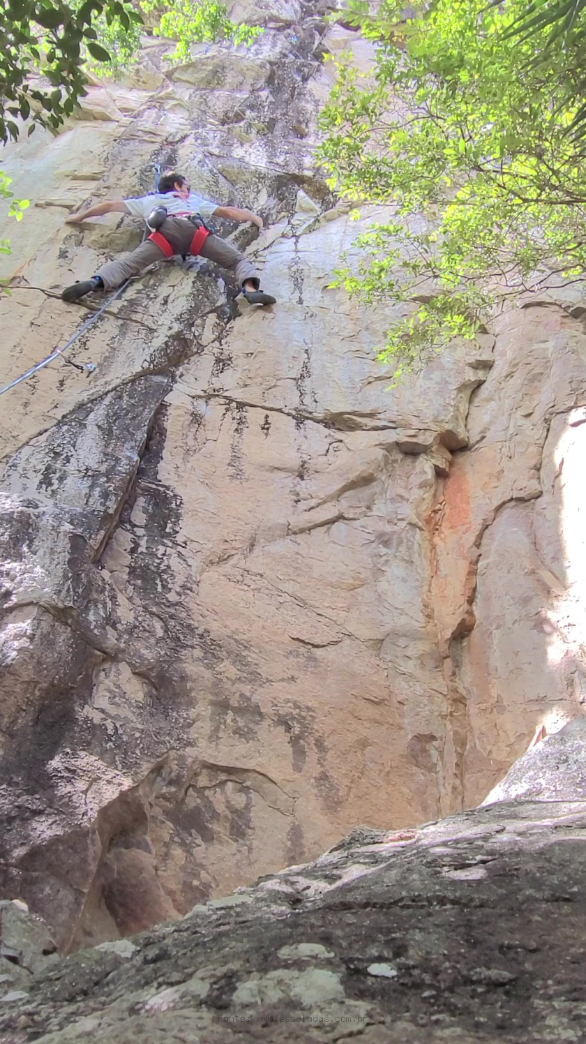 Descrição: Escalada esportiva levemente negativa, é a última via desta face. Caminhe margeando a pedra após o bloco da face norte.