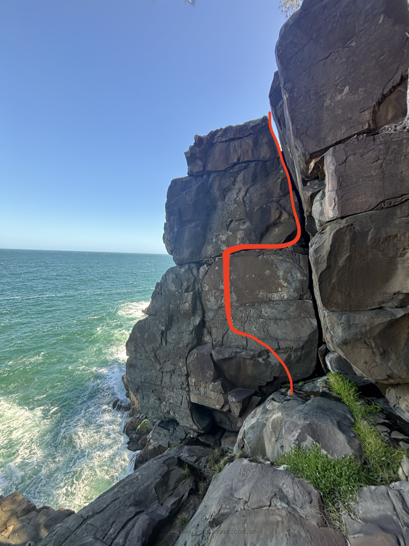 Descrição: A via começa na base da rachadura principal, indo primeiro para a ledge logo à esquerda, e seguindo a rachadura horizontal para a vertical, com as duas paredes à disposição para se subir.