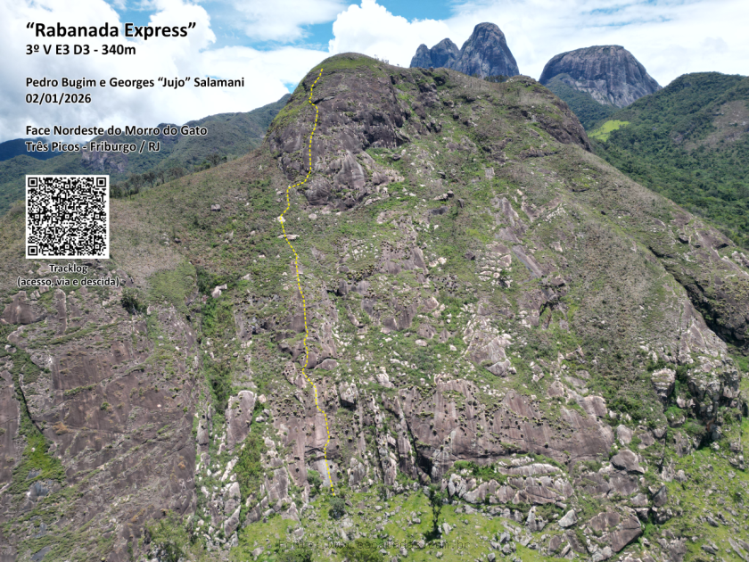 Descrição: Via totalmente de aventura! Sua primeira enfiada representa a mais técnica, iniciando em lances de aderência, passando por uma belíssima barriga bem aérea, protegida em friends pequenos, evoluindo para lances em abaulados e aderência, onde está o crux da via. A segunda enfiada perde inclinação e, apesar de alguns lances bonitos, é bem mais simples. A terceira enfiada inicia em alguns costões, até que seja necessário "varar mato", passando por um grande bloco, com um lance que pode ser protegido com um friend grande até chegar a um enorme bloco branco, onde fica a P3. A quarta enfiada é basicamente em "vara mato" até a P4. A quinta enfiada (já no "headwall") também é muito bonita e limpa, contando com um lance mais delicado em aderência e abaulados. A sexta enfiada contorna uma grande barriga pela esquerda, chegando nos costões finais da montanha. Após a P6, ainda há uns 10 metros de escalada fácil, passando pela última chapa da via, até o vara mato para o cume. Nos lances técnicos, o rapel pode ser feito sempre em paradas duplas, com corda única de 60 metros, entretanto, algumas enfiadas possuem apenas parada simples e em alguns trechos, será necessário descer os lances de vegetação caminhando. O ideal é fazer cume, seguir até o cume principal do Morro do Gato e descer pela fácil e demarcada trilha. O nome da via se deu pelo fato de ser virada de ano (Rabanada), unido ao fato da conquista ter levado meras 2 horas e 45 minutos, da base ao cume (Express). Ao lado esquerdo da primeira enfiada, há a via "Calipto", da qual é compartilhado o trecho da primeira barriga em móvel.