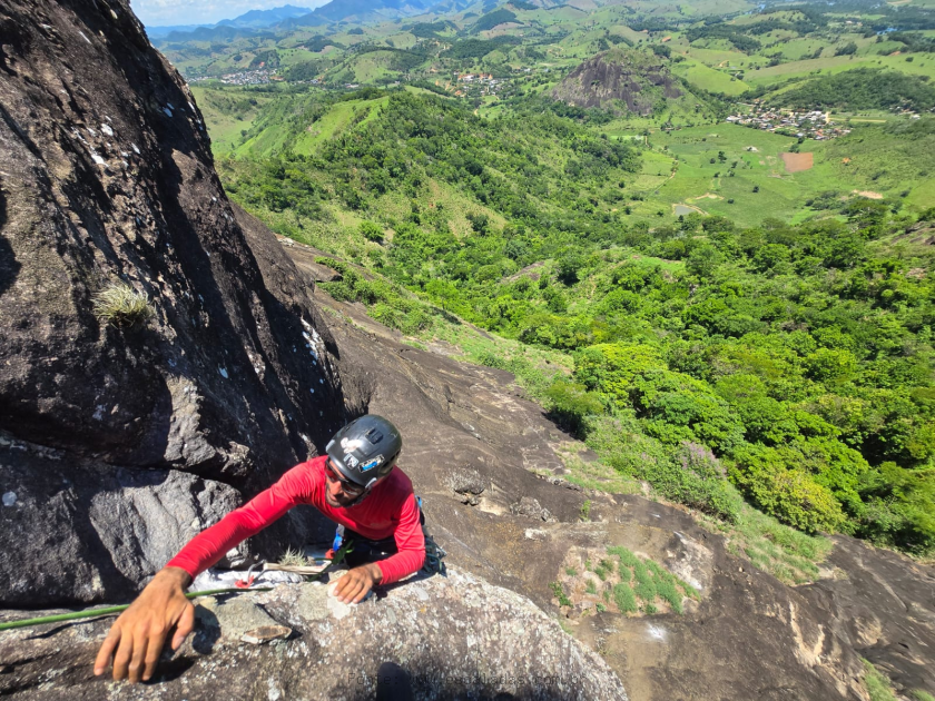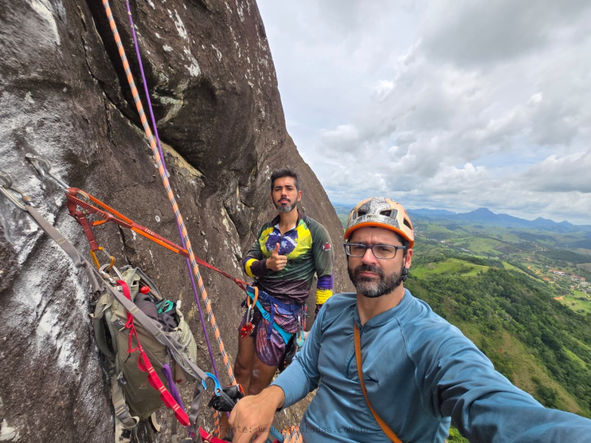 Descrição: Via em aderencia e agarras, iniciando e terminando positiva com terço médio vertical. Trecho de aproximadamente 10m pode ser feito em A0 ou em livre (grau a confirmar). A via pode ser descida,por rapel e tambem por trilha, ja que a última parada dupla está colada na trilha de acesso ao topo.