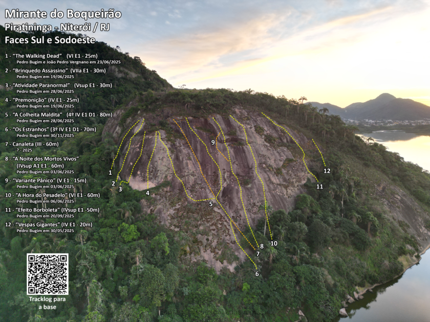 Descrição: Via técnica, em pequenas agarras, com uma primeira metade bem vertical e delicada. Boa proteção em chapas simples de aço carbono 1020, com parada dupla no topo em chapas PinGo Inox 316L. Para o acesso à base, recomenda-se vir do cume e rapelar, apesar de possuir trilha contornando o cume pela face norte.