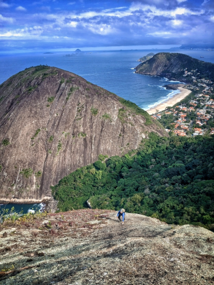 Descrição: A Agulha Guarischi fica encravada no meio da Enseada do Bananal, espremida entre o Morro do Telégrafo, Alto Mourão e o mar. Ela possui um dos cumes mais espetaculares do estado Rio de Janeiro, onde é possível ficar com uma perna em cada face da montanha, como se estivesse montado em um cavalo. Para acessar a base, é preciso pegar a trilha na entrada do Parque Estatual da Serra do Tiririca, na praia de Itacoatiara, na cidade de Niterói. Essa trilha sobe por um caminho bem definido, mas em seguida aparece uma clareira, uma espécie de trevo. Nesse momento é preciso seguir reto, descendo na direção da Enseada do Bananal. Indo para a esquerda é a trilha para as vias de escalada do Morro do Telégrafo; para a direita é a trilha para o costão de Itacoatiara. Seguindo na direção da enseada, após alguns minutos, a trilha segue próxima do mar, onde existe um grande bloco de pedra. Logo após esse grande bloco de pedra, é preciso pegar uma trilha para esquerda, na direção da Agulha Guarischi, mas esse trecho não é muito bem definido. De qualquer forma, em muitos momentos é possível enxergar a Agulha e se orientar.