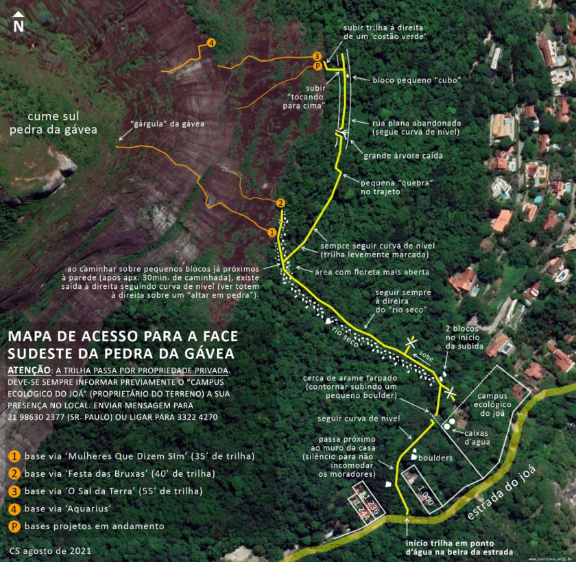 Descrição: A base da via fica a 50m da C-100. Uma das mais bonitas via do RJ, certamente. Diedros, fendas, tetinho, aderências. Antes do 1º teto, logo abaixo da parada que dá início à horizontal, pode-se proteger com um Camalot #3. O lance em artificial do 1º teto pode ser realizado em livre, seguindo um pouco mais a direita em entalamentos de dedos e depois dominando o tetinho. Atenção: não pare na pedra entalada (perigoso!) como sugere o croqui, fazendo assim o diedro em um único e belo esticão.