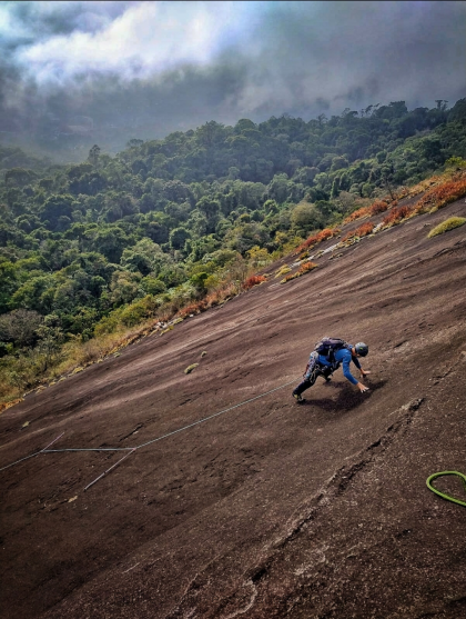 Escaladores Friburguenses na primeira enfiada da Caminho do Sol; e escalador Job de Assis na segunda enfiada. Foto: Alexandre Coutsoumbos