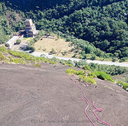 Descrição: Localizada à esquerda da via Universos Paralelos, possui lances com proteções de qualidade duvidosa: grampinhos antigos de ¼”, com olhal de argolinha. O que mais chama a atenção na via é um pequeno teto, no final do segundo esticão, com três agarras de resina e que, feito em livre, está cotado em VIIIa. É composta de lances em livre, em agarras e aderência, e trechos em artificial fixo e cliffhangers. São necessários 1 par de estribos e cliffs para laca e buraco de ¼”.