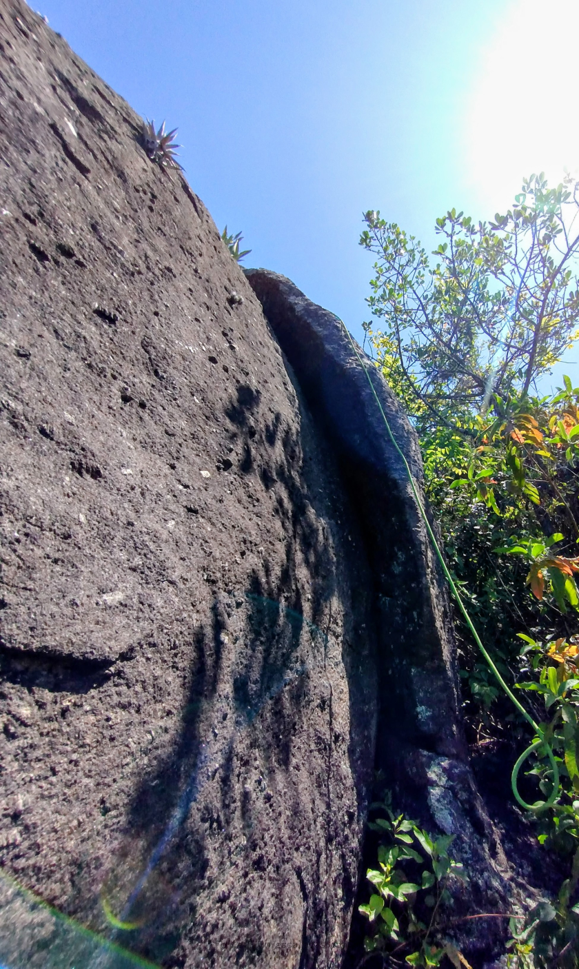 Descrição: A característica mais marcante da via é uma fenda em oposição, tendo sido inteiramente conquistada em "solo". Posteriormente, Paulo "Bruxo" retornou à via, quando a grampeou por completo e a estendeu, terminando na Vr. São Bento, à sua esquerda.
