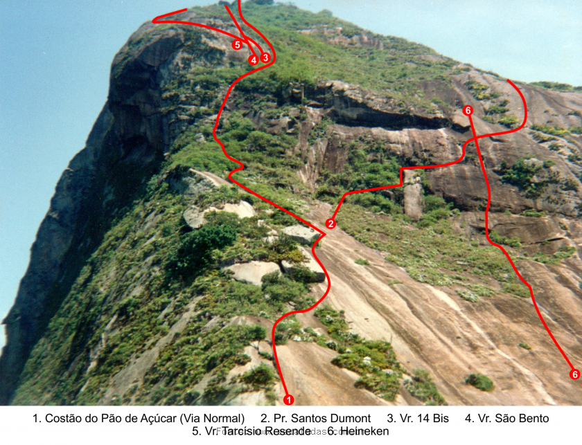 A face leste do Pão de Açúcar com a indicação da "Vr. 14 Bis" (via de nº 3) e demais variantes. Foto: Luciano Bender. Traçados: Luciano Bender / Mauro Mello