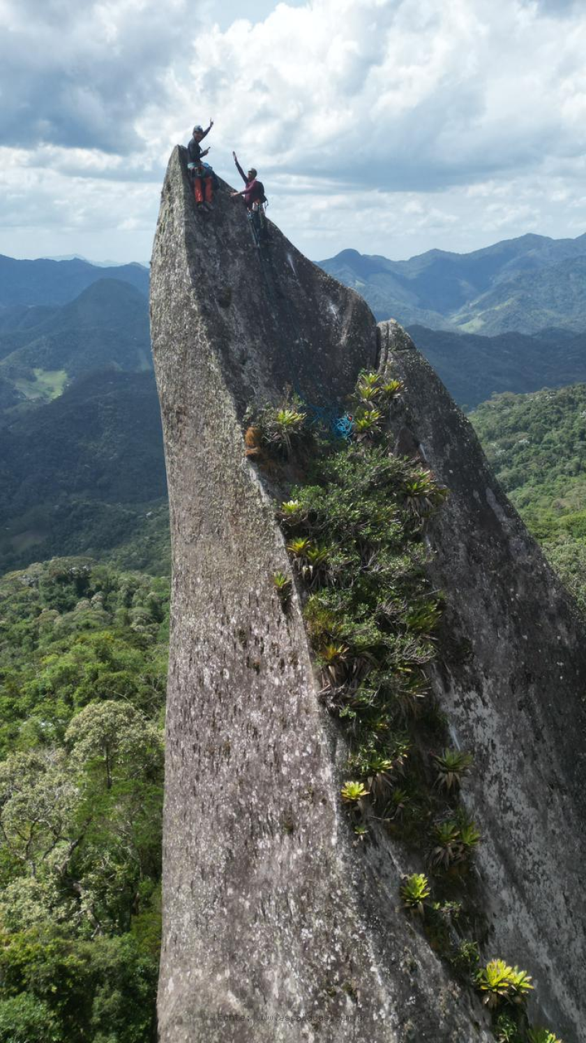 Para se chegar ao último grampo, é necessário montar na pedra, já que o topo é bem estreito. O cume tem o tamanho suficiente para se ficar em pé sobre ele.