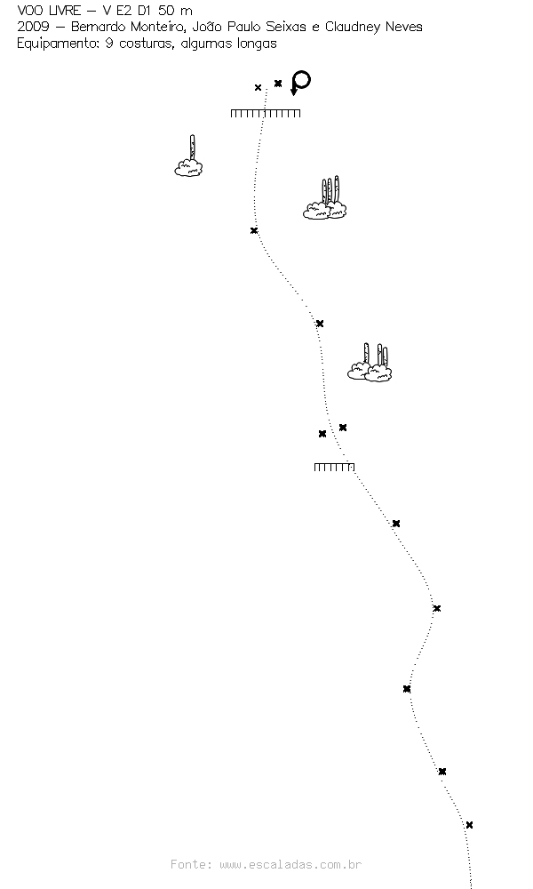 Descrição: O crux fica na entrada da via, em um lance vertical, mas com ótimas agarras. Depois da segunda proteção a via perde inclinação e segue predominantemente em aderência.