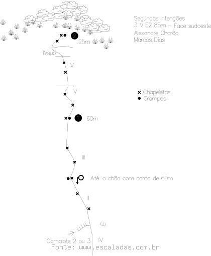 Descrição: Seu crux fica logo nos primeiros metros de via (pode ser feito em A1). Bonita via, bem protegida e bem constante na graduação.