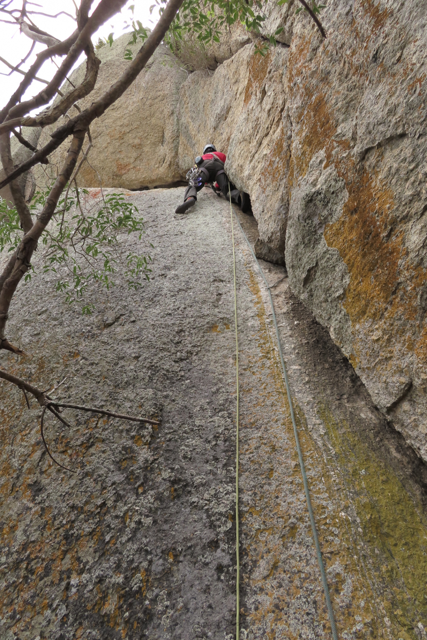 Descrição: Excelente escalada de fendas, muito variada, com passagens em oposição, entalamento de mãos e pés, fenda de meio-corpo e chaminé. Proteção móvel, sempre muito sólida. Parada dupla com grampos no topo.