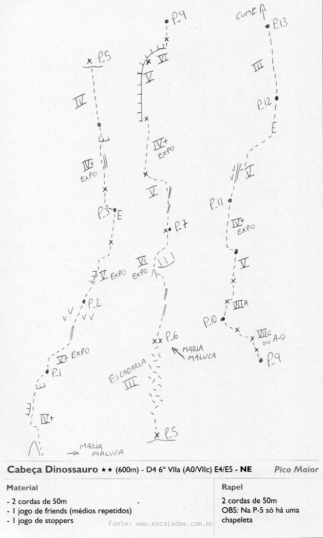 Descrição: Escalada bastante exposta na sua primeira metade. A segunda parte é mais vertical, com enfiadas de rara beleza, sendo mais protegida que o início.