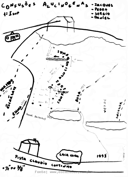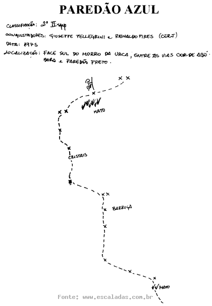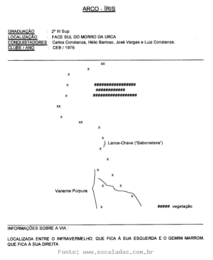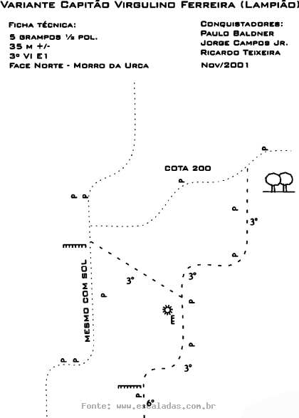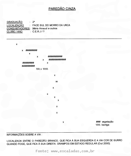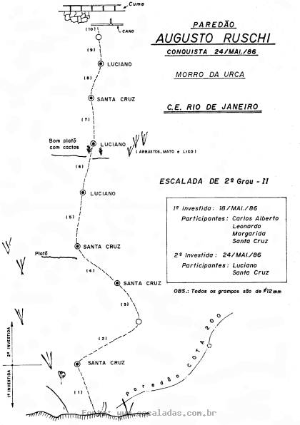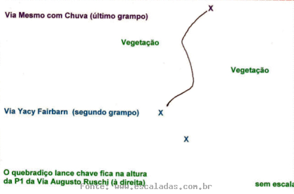 Dos fundos da referida imobiliária, há uma escada de ferro chumbada à rocha. Deste ponto, há um lance curto e fácil para chegar à canaleta de água, que percorre toda a extensão da parede.
