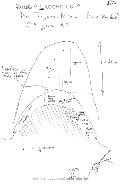 Descrição: A via fica à esquerda da chaminé que leva ao Paredão Crocodilo. A descida é pela chaminé. Pode-se desescalar ou rapelar do Crocodilo. Se for para o cume, é pela via Crocodilo.