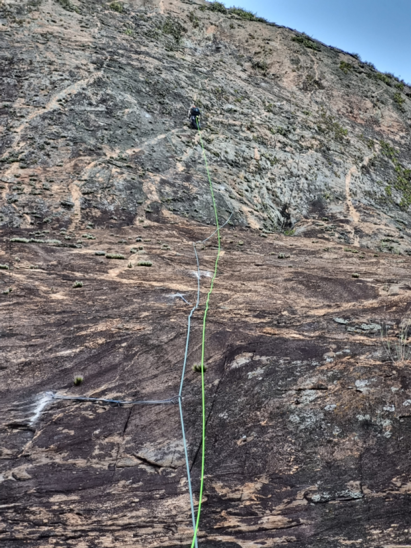 Descrição: A primeira enfiada começa em um costão de III de aproximadamente 40m e passa por uma parede vertical de mais 20m. A segunda enfiada é a mais exigente da via, com lances de Vsup e o crux de VI. Já as últimas enfiadas são em costão de III até próximo do cume. Caminhar até o cume da última parada.